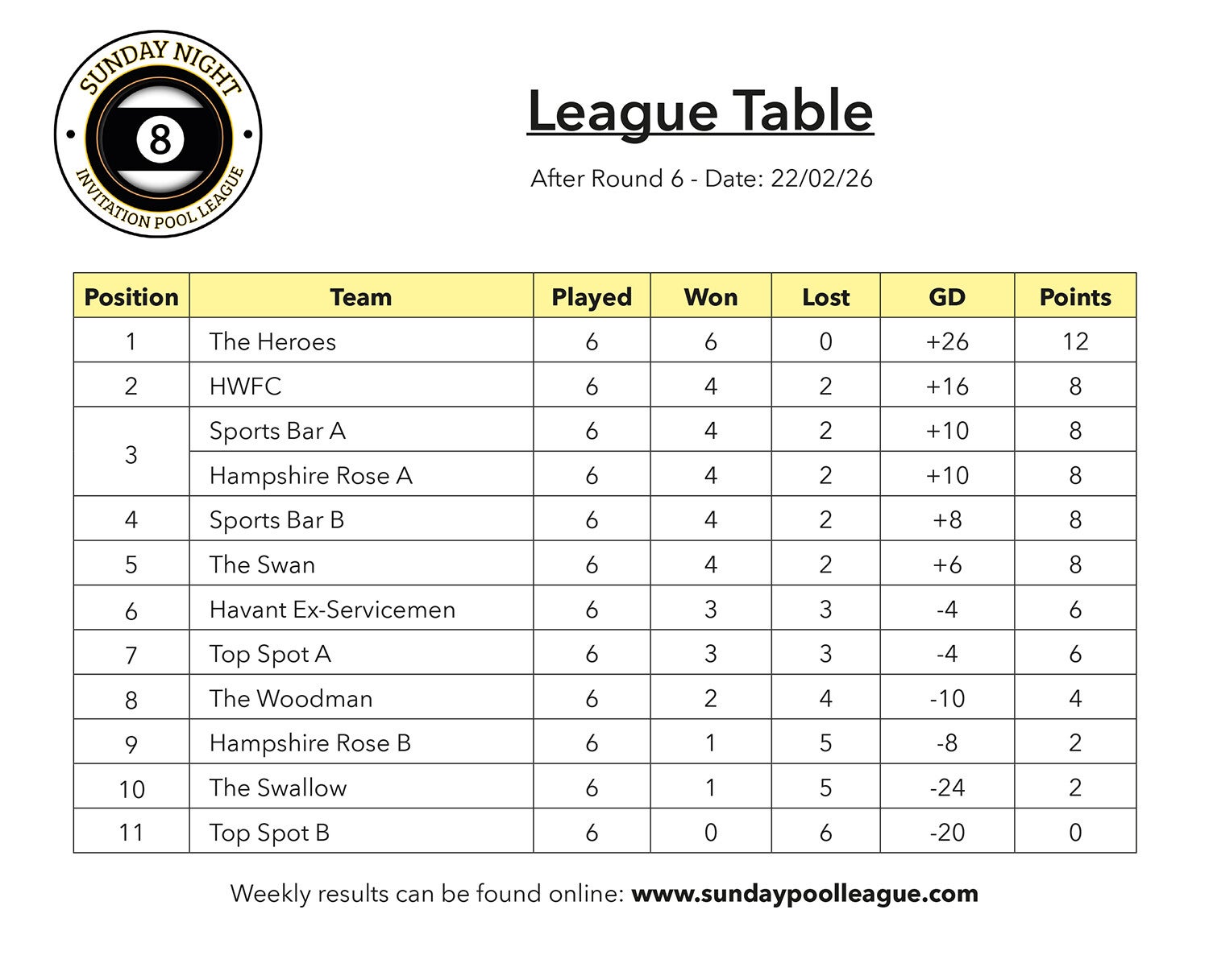 Welcome to the Havant & Waterlooville Sunday Invitation Pool League